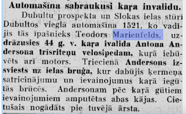 1937. gada augustā notika daudz nopietnāka nelaime - Dubultu prospekta un Slokas ielas stūrī Marienfelds ar vieglo sporta automašīnu (numurs 1521) uzdrāzās 44 gadus vecā kara invalīda Antona Andersona trīsriteņu velosipēdam ar iebūvētu motoru. Triecienā Andersons tika izsviests uz ielas bruģa, kur dabūja ķermeņa satricinājumu un ievainojumus karā iegūtās brūcēs. Andersonam pēc karā gūtiem ievainojumiem bija amputētas abas kājas. Cietušo nogādāja pie tuvējā ārsta.