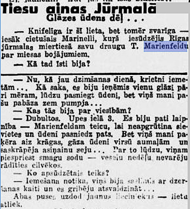 Pēc trim gadiem – 1931. gada 26. decembrī viņš apprecējās ar Elzu Pols (Pohl), bet 1934. gada 23. augustā viņi pie notāra atcēla laulāto mantas kopību. Nākošajā, 1935. gadā Teodoram nācās stāties miertiesneša priekšā. Pēc dzimšanas dienas svinībām Upes ielā 3 ar “stiprāku” dzērienu lietošanu, viņa viesim Leopoldam Marinelli radās stipras slāpes. Viņš pieprasīja miesnieka kundzei glāzi auksta ūdens. “Nepadari manu sievu par kalponi. Prasi ūdeni manai kalponei," aizrādīja namatēvs. Bet tā kā viesis kalponi neatrada, viņš gāja pats meklēt ūdeni un sētā blakus pumpim kliedza: „Kur ūdens?” Iznāca Teodors, pieveda kliedzēju pie pumpja, nolieca zem tā viņa galvu un sāka pumpēt uz to aukstu ūdeni. Otrā dienā Marinelli konstatēja vieglus miesas ievainojumus, par kuriem cēla sūdzību pret Marienfeldu, prasot 200 Ls “sāpju naudas”. Miertiesnesis lietu atlika.