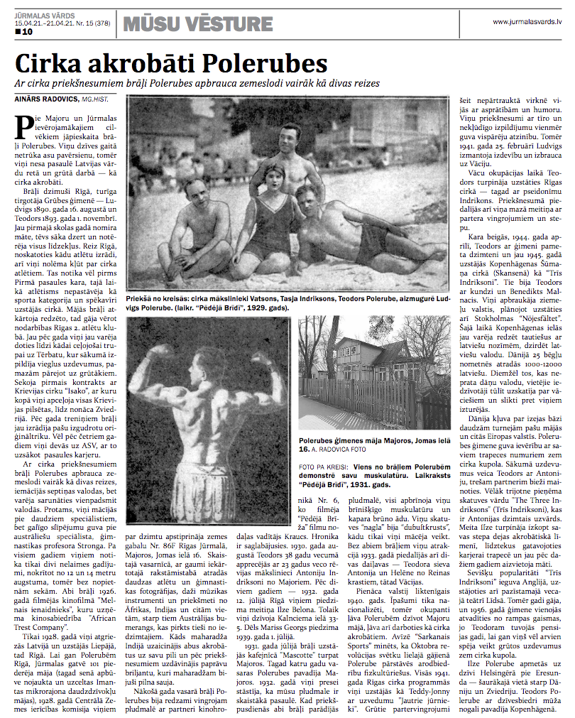 Pie Majoru un Jūrmalas ievērojamākajiem cilvēkiem jāpieskaita brāļi Polerubes. Viņu dzīves gaita netrūka asi pavērsieni, tomēr viņi nesa pasaulē Latvijas vārdu tik grūtā nodarbē kā cirka akrobāti.