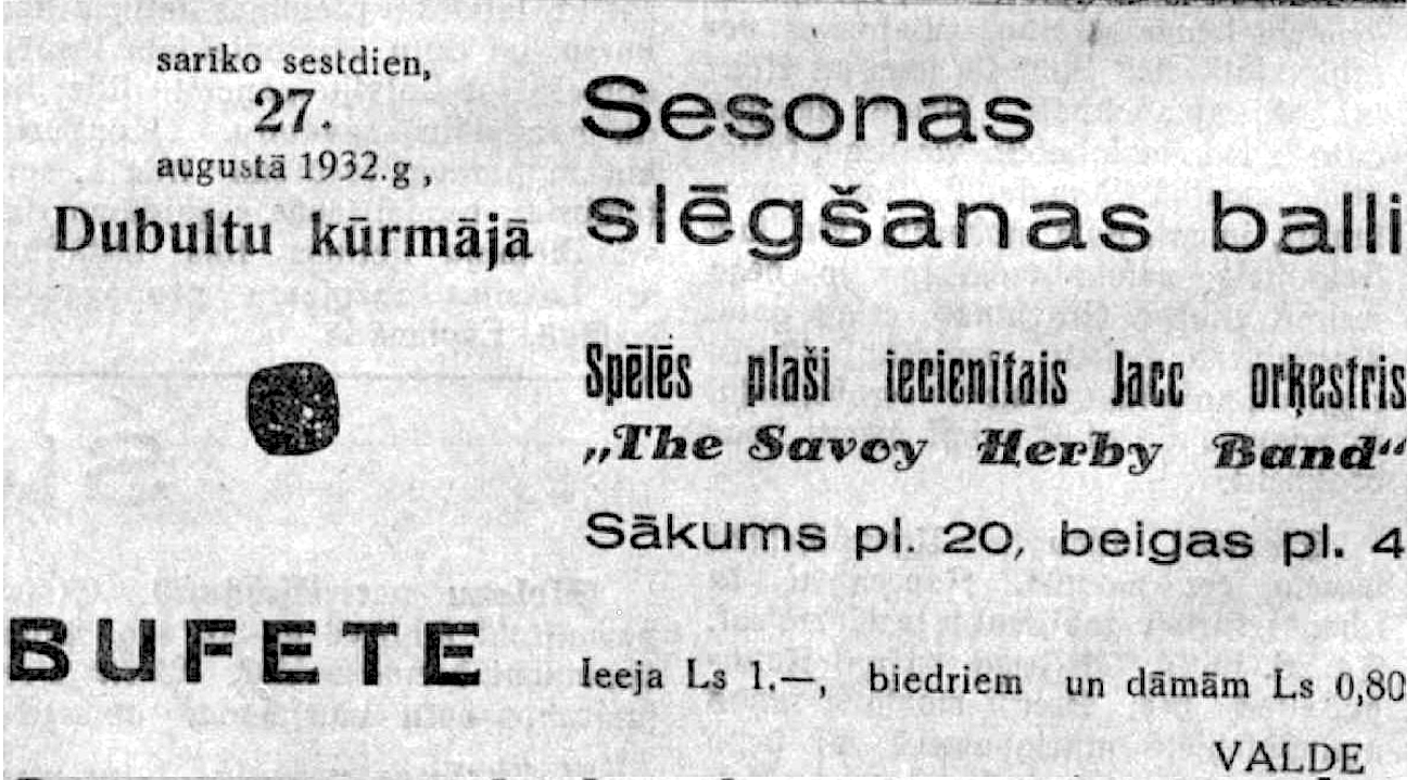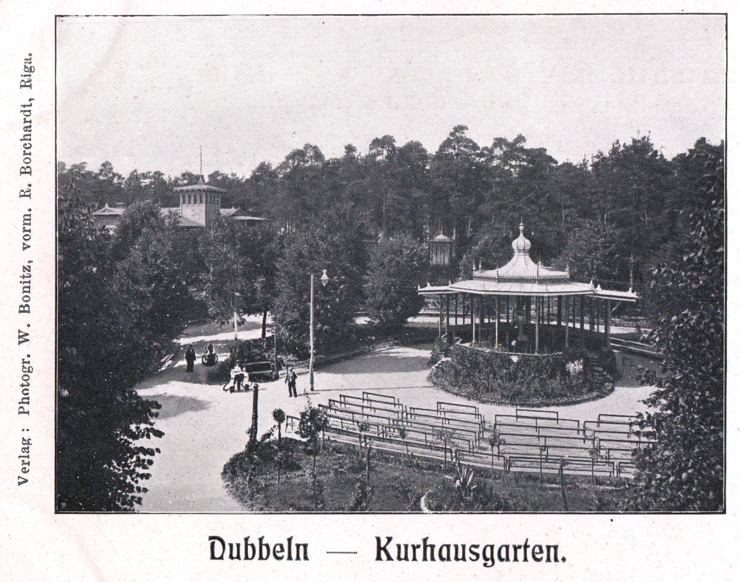 „Jūrmalā mēs apmetāmies Dubultos. Vietējās kūrmājas skaistais dārzs bija nocirsts, jo taisni šai vietai gājuse pāri kāda mūsu stratēģiska līnija, vispirms, protams, uz papīra, tad ar zāģi un cirvi pa lapoto dārzu. Žēl bija redzēt tagad kailos dārza celiņus, un pussagāzto mūzikas gliemežnīcu, kur vēl vienpadsmitā gadā es kā orķestrants tiku spēlējis simfonisko koncertu sezonu ar mūsu pilsētas teātra vecā orķestra labo sastāvu. Ari pretim stacijai puslokā celtā, reiz lepnā kūrmāja atstāja postažas iespaidu: logus izbirdinājuse un vienu galu ēkas sagāzuse bija kāda vācu eskadre 1915. gadā, apšaudot no jūras smagiem lādiņiem visu kūrmājas tuvāko piekrasti.”[33]