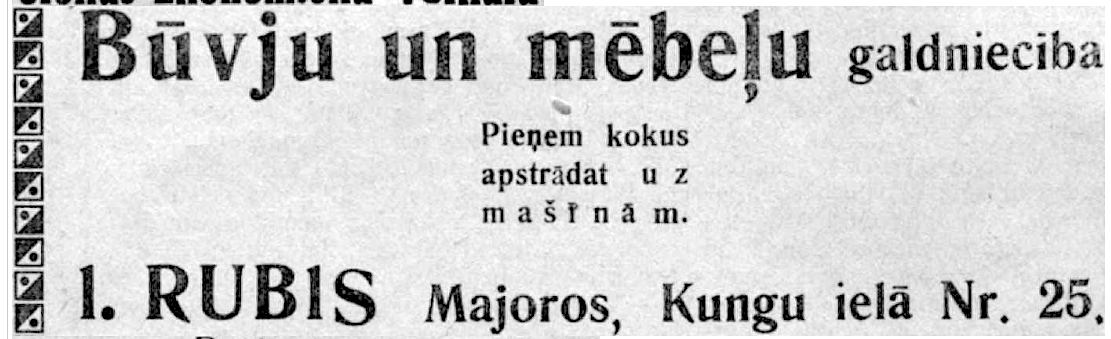 Latvijas brīvvalsts laikā ēkā darbojās Jāņa Rubja galdniecība (sk. pielikumu). Pilsētas valdes protokolu grāmatās lasāms, ka Rubja galdniecība ar panākumiem piedalījās galdnieku darbu izsolēs: 1923. gada 15. septembrī remontdarbiem pilsētai piederošā ēkā Baznīcas ielā 5, 29. decembrī galda un skapja izgatavošanai pilsētas galvai, 1933. gadā durvju un logu izgatavošanai ģimnāzijai (A. Radovics. Dubultu vēsture. Jūrmalā: 2019, 72., 213. lpp.). Jānis Rubis bija Majoru Aizsargu nodaļas priekšnieks un kopš 1908. gada Brīvprātīgo ugunsdzēsēju biedrības biedrs. 1938. gada 22. oktobrī kopā ar dēlu Kārli abi noslīka Lielupē (sk. pielikumus).