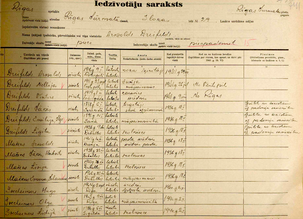 Stāsta Līvija Veģe dzim. Mačēns: " Koku šķirotājs Arnolds Dreifelds (1916. gada 9. janvārī, Pēterpillī) bija pārbraucis no Krievijas ar iekrātu naudu un atvēris kokmateriālu veikalu. Tikko [Jānis] Dreifelds 1936. gadā uzcēla divstāvu māju Slokas ielā 29, Mačēni apmetās tur, otrajā stāvā, dienvidu pusē. Ziemeļu puses dzīvokli izīrēja vēlāk [1940. g.] - vācu/poļu Švecheimera ģimenei. Jaunās mājas 1. stāvā bija veikals un īpašnieku dzīvoklis, bet plašajā gruntsgabalā nojume kokmateriāliem. Bija ļoti labi cilvēki. Piederēja zirgi, kundze Nellija (1911. gada 23. septembrī, Ventspilī) turēja cūkas.