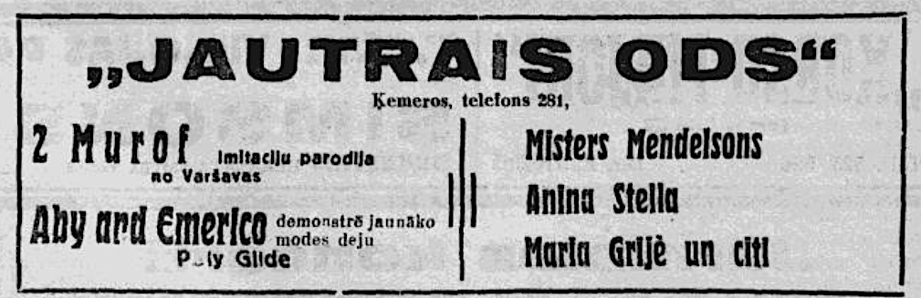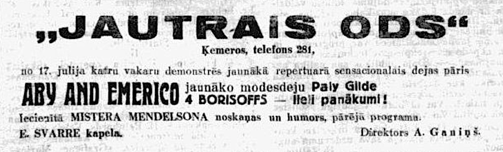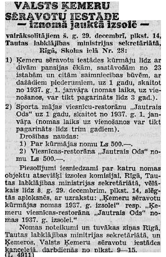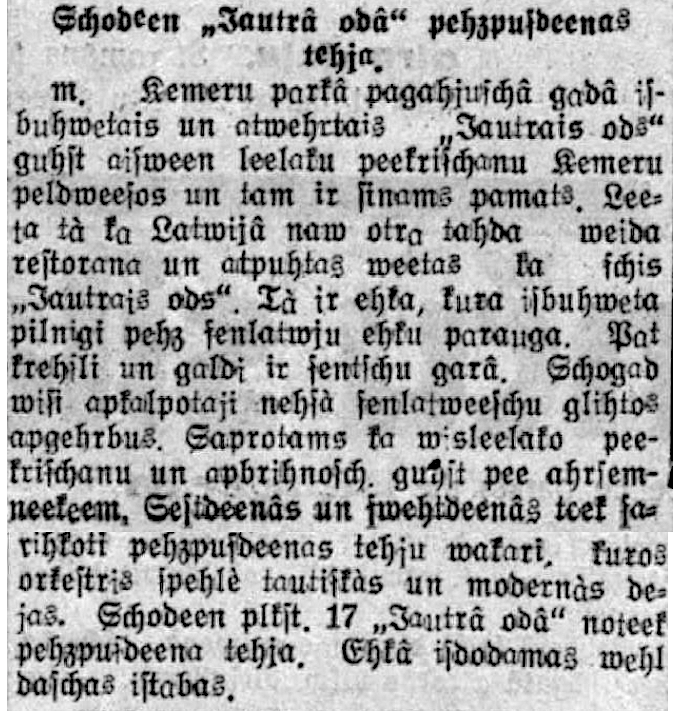 Vēlākos gados komplekss pārtapa par populāru restorānu „Jautrais ods”. 1934. gadā pat apkalpotāji nēsāja "senlatviešu glītos apģērbus". Sestdienās un svētdienās tika rīkoti pēcpusdienas tējas vakari, kuros orķestris spēlēja tautisko un moderno deju mūziku. Katru vakaru viesus izklaidēja kabarē programma. Ēkā bija iespēja izīrēt dažas istabas. Restorānā mēdza iegriezties gan Benjamiņu pāris, gan citas sava laika pazīstamas personības. Vakaros uz atvērtās terases mutuļoja dejas un notika arī augstvērtīgi koncerti. Vēlāk terase tika aizstiklota, lai smalkos viesus pasargātu no asinskāro odu uzbrukumiem.