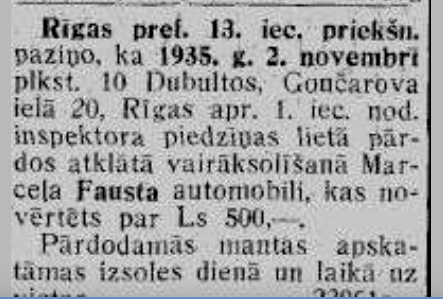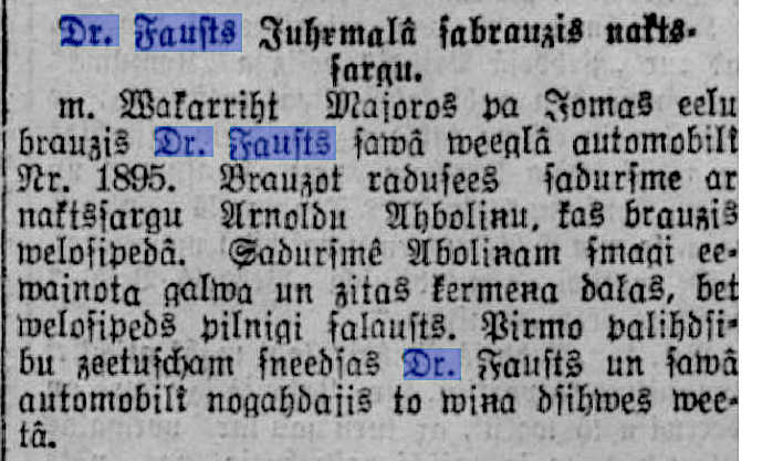 Pēc tam pašam ārstam gadījās nelaime: 1929. gada 9. oktobrī plkst. 19.50 braucot ar vieglo automašīnu pa Tērbatas ielu pret namu 20 viņš pilnā gaitā uzdrāzās 14 g. v. Laimonim Noriņam no Daugavpils ielas 21. Zēns tika notriekts uz ielas bruģa un mašīna pārbrauca viņam pāri. Noriņš bija vārīgi ievainots kājā, pārsista galva un viss ķermenis satriekts. Viņu nogādāja Bērnu slimnīcā. Faustam šis gadījums nebija pirmais, arī pagājušajā vasarā viņam tāda nelaime notika ar kādu bērnu Jūrmalā.