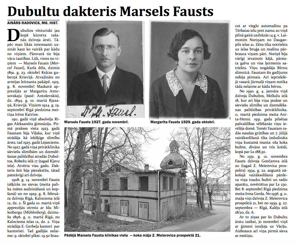 Dubultos vēsturiski jau kopš kūrorta rašanās dzīvoja ārsti. Pārsvarā tie bija vācu tautības. Lūk, viens no viņiem – Marsels (Marcel) Fausts (Faust), Karla dēls, dzimis 1891. g. 23. oktobrī Keļcas guberņā Krievijā. Atvaļināts no armijas leitnanta pakāpē. 1915. g. 8. novembrī Maskavā apprecējās ar Margaritu Antosovskaju (pasē: Antoševskis), dz. 1894. g. 10. martā Rjazaņā, Krievijā. Viņiem 1924. g. 19. septembrī Rīgā piedzima meitiņa Irēne Katrīne.