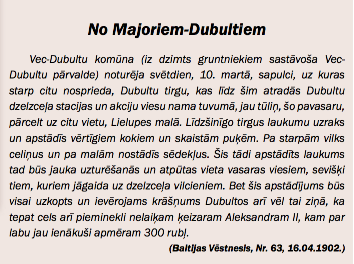 Elizabetes Knobles atmiņās[1] uzzinām, ka „Tirgus Dubultos bija pāri pretim Dubultu stacijai. Gar vienu malu bija vaļējas bodītes ar dažādiem saldumiem, starp citu Jāņu maizi – tumši brūnām, gareniskām, pacietām pākstīm. Tās bērni labprāt sūkāja. Netālu atradās krogs, kur sabraukušie laucinieki mēdza novietot savus zirgus, kamēr uz tirgus no vezumiem iztirgoja, ko bija atveduši: svaigu sviestu no maziem koka spainīšiem, kautus un dzīvus cāļus, lauku maizi, olas, krējumu, knapsieriņus (biezpiena sieriņi ar ķimenēm), ogas, saknes un vēl visu, ko var vēlēties.” Vecdubultu tirgus pirms Pirmā Pasaules kara bija visrosīgākais tirgus Rīgas jūrmalā.[2]