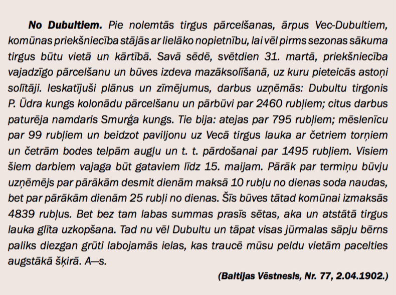 1887. gada P. P. kunga atmiņās arī pieminēts Dubultu tirgus: "Mēs bijām apmetušies namā pie paša tirgus plača. Mans brālēns domāja, ka tas esot derīgi – priekš labas ēstgribas modināšanas, ka katru rītu, vēl gultā gulēdams, varot noskatīties uz pārdodamiem cāļiem, pīlēm, olām, gaļu un augļiem. „Vaj redzi M. kungu?” viņš, kādu rītu pamodies, uz tirgu skatīdamies, jautāja. Es pacēlu galvu un ieraudzīju, ka minēts kungs vakardienas uzvalkā gāja dūšīgi no vezuma uz vezumu un nepalaida neko garām, iekam nebij noprasījis cenas un neizdiņģējies, un, kad mazais tirdziņš uz ilgu laiku nepietika, tad sāka otrreiz no gala. Tikai priekš pulksten deviņiem viņš pārnāca, bet, protams, tukšām rokām, nenieka nopircis. Bet par to viņš zināja, cik dārgi vēži katrā vezumā, cik maksāja plekstes un ka zaļu zirņu stops šodien par pus kap. lētāks kā vakar. Spēlējām atkal uz vēžiem un tā tas pēc tam vēl dažudien atgadījās. M. kungs katru rītu visumaz divi stundas ilgi staigāja pa tirgu, ja nebij vēss, tad arvien zināmā uzvalkā un katru rīt no tirgus pārnāca ar tukšām rokām. Pēcāk tas atkal rājās ar savu kundzi, ka tā tirgū par dārgi aizmaksājusi; viņš esot visu atradis daudz lētāku."[3]