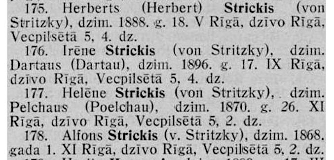 Gruntsgabals Z. Meierovica prosp. 32 ar 3 koka ēkām (6588 m2 ; IV-4-40) līdz 1939. gadam piederēja Strickim Alfonam, Eriham, Herbertam un Alisei. 1931. gada 31. jūlijā īpašums tika apdrošināts a/s „Daugava”; tas sastāvēja no 2 dzīvojamām ēkām, ledus pagraba, motora mājiņas un koka verandas. Starp inventāra priekšmetiem minēti 11 nakts trauki.