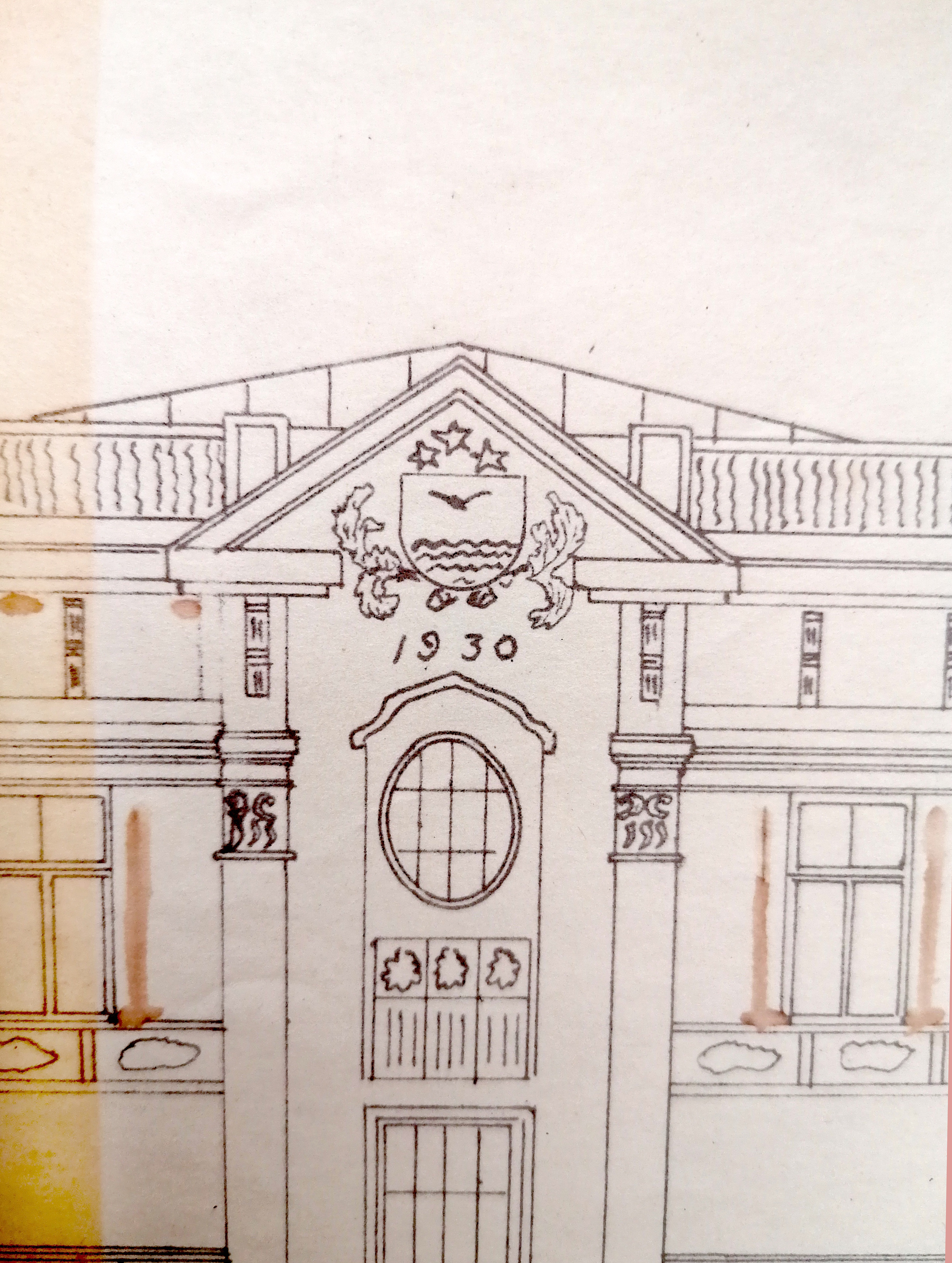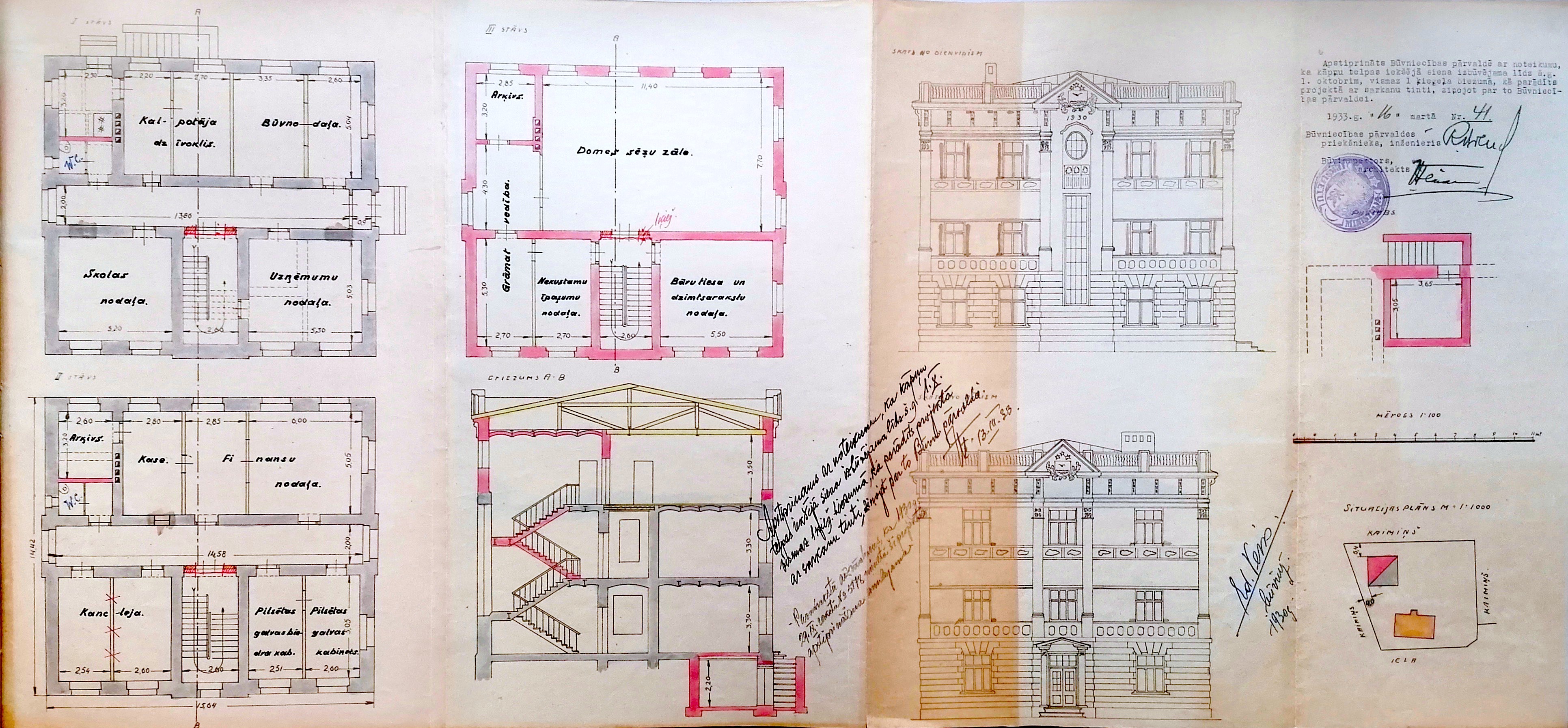 Interesanti, ka projektā redzama daudz greznāka ēka ar horizontālām joslām apmetumā pirmajā stāvā un ornamentētām joslām starp augšstāviem. Virs ieejas frontonā bija iecerēts pilsētas ģerbonis. Jauno ēku tā arī neapmeta un to izdarīja jau padomju laikā, neveidojot paredzēto skaisto apdari. Atklāts paliek jautājums – kāpēc? Vai pilsētai pietrūka līdzekļu savam prestižam?
