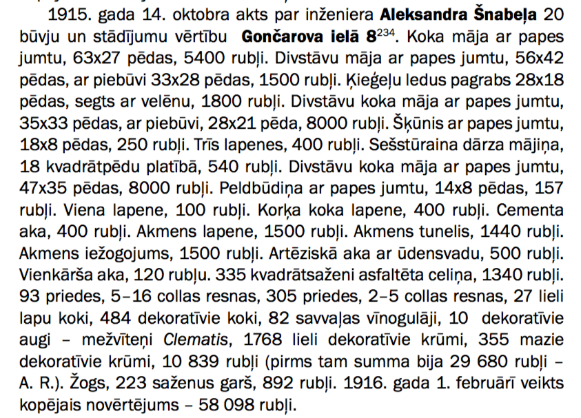 Kādreiz skaistās inženiera Aleksandra Šnabeļa koka divstāvu ēkas Aspazijas ielā 4 (senāk Gončarova iela 8, tad Z. Meierovica prospekts 11) celšanas gads nav zināms. Toties Latvijas vēstures arhīvā saglabājies 1915. gada krievu armijas veiktā īpašuma ēku un stādījumu novērtējums (sk. pielikumu). Jūrmalas muzeja krājumā atrodas 1936. gadā viņa pasūtīts projekts ēkas otrā stāva pārbūvei (sk. attēlu). Pēc tam ēka pārgājusi vācbaltietes Veras Cimermanes īpašumā, kura 1939. gadā izceļoja uz Vāciju. Īpašums pārgāja Latvijas Hipotēku bankas īpašumā un arhīvā saglabājušās 4 fotogrāfijas no 1940. gada pavasara.