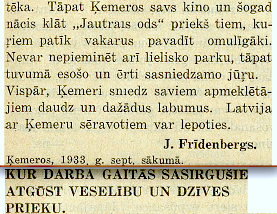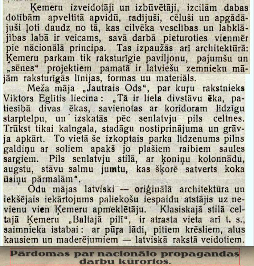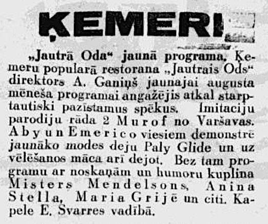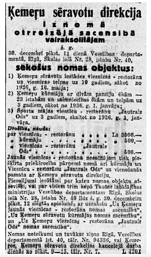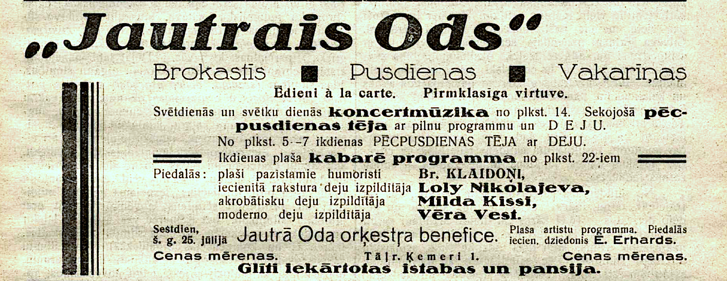 Vēlākos gados komplekss pārtapa par populāru restorānu „Jautrais ods”. 1934. gadā pat apkalpotāji nēsāja "senlatviešu glītos apģērbus". Sestdienās un svētdienās tika rīkoti pēcpusdienas tējas vakari, kuros orķestris spēlēja tautisko un moderno deju mūziku. Katru vakaru viesus izklaidēja kabarē programma. Ēkā bija iespēja izīrēt dažas istabas. Restorānā mēdza iegriezties gan Benjamiņu pāris, gan citas sava laika pazīstamas personības. Vakaros uz atvērtās terases mutuļoja dejas un notika arī augstvērtīgi koncerti. Vēlāk terase tika aizstiklota, lai smalkos viesus pasargātu no asinskāro odu uzbrukumiem.