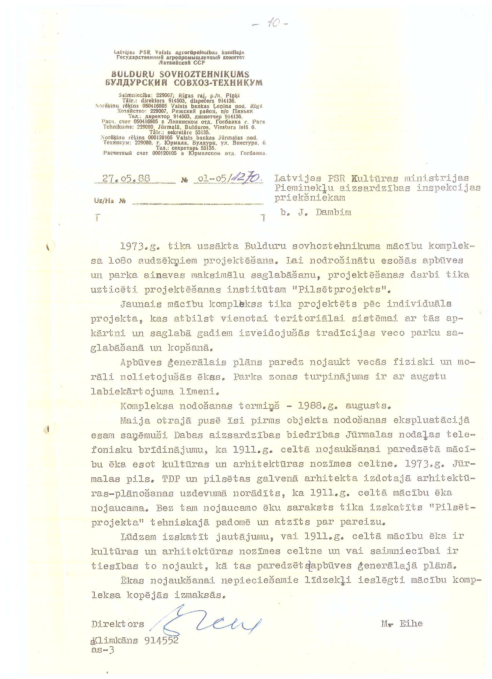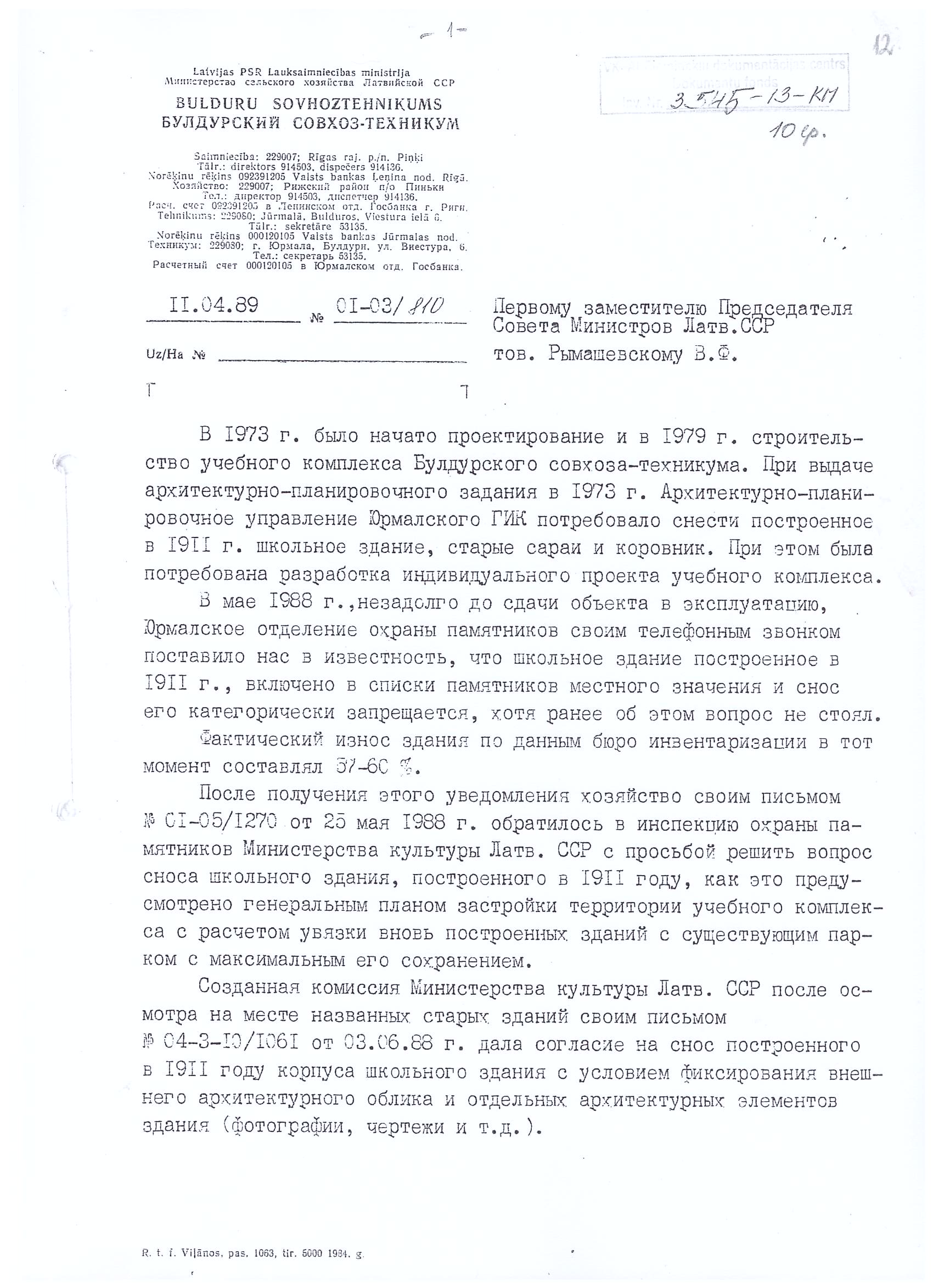 1973.gadā apstiprināts Bulduru tehnikuma mācību kompleksa ģenplāns, kurā ēku paredzēts nojaukt sakarā ar jaunā mācību korpusa projektēšanu.